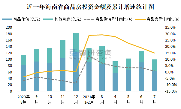 根據國家統計局數據統計可知:2021年7月海南省房地產開發投資商品房投資金額為99.76億元(其中商品住宅為64.5億元,辦公樓、商業營業用房等其他用房35.26億元);2021年1-7月海南省房地產開發投資商品房累計投資金額為704.03億元,投資金額累計同比增長15.1%。