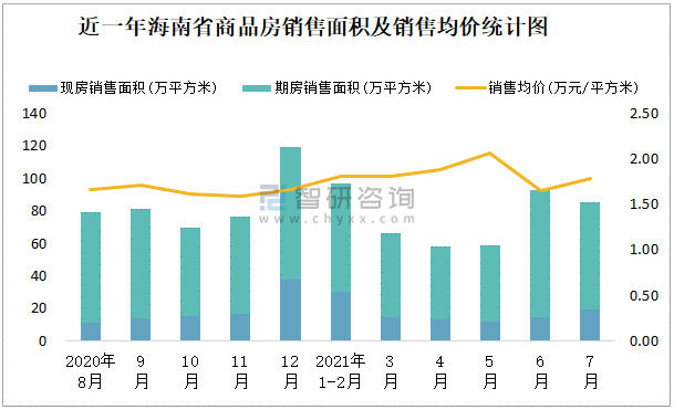 近一年海南省商品房銷售面積及銷售均價統計圖