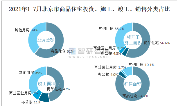 2021年1-7月北京市商品住宅投資、施工、竣工、銷售分類占比