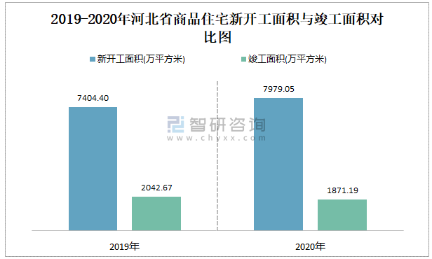 2019-2020年河北省商品住宅新開(kāi)工面積與竣工面積對(duì)比圖
