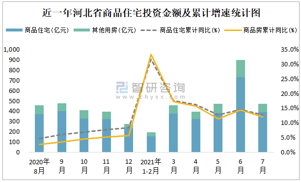 近一年河北省商品住宅投資金額及累計(jì)增速統(tǒng)計(jì)圖
