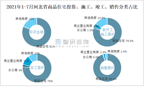 根據(jù)國(guó)家統(tǒng)計(jì)局?jǐn)?shù)據(jù)統(tǒng)計(jì)可知:2021年1-7月河北省房地產(chǎn)開(kāi)發(fā)企業(yè)在商品住宅中投資金額占比為81.5%(注:只有投資金額中其他用房包含辦公樓、商業(yè)營(yíng)業(yè)用房),商品住宅的新開(kāi)工面積與竣工面積所占比重差異不大,從銷售面積來(lái)看,商品住宅為銷售主力(占比高達(dá)95%),辦公樓銷售面積占比少于商業(yè)營(yíng)業(yè)用房銷售面積占比。
