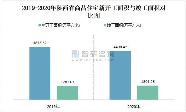 2019-2020年陜西省商品住宅新開工面積與竣工面積對比圖