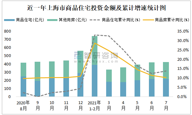根據國家統計局數據統計可知:2021年7月上海市房地產開發投資商品房投資金額為423.81億元(其中商品住宅為217.63億元,辦公樓、商業營業用房等其他用房206.18億元);2021年1-7月上海市房地產開發投資商品住宅累計投資金額為1383.91億元,投資金額累計同比增長13.7%。