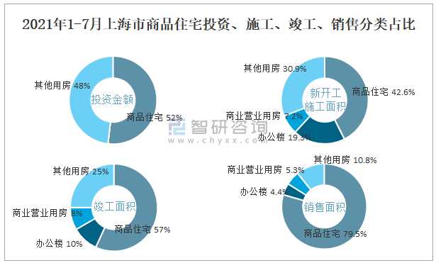 2021年1-7月上海市商品住宅投資、施工、竣工、銷售分類占比