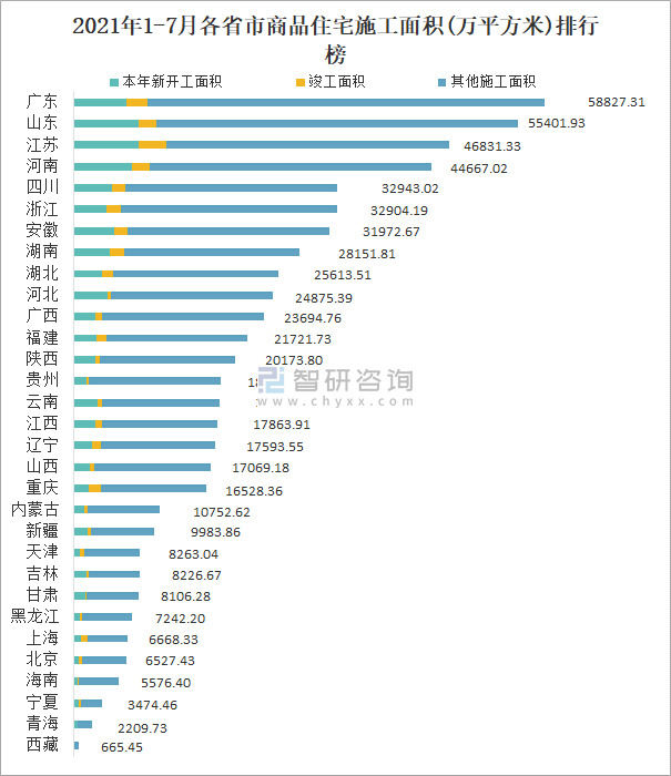 2021年1-7月各省市商品住宅施工面積(萬平方米)排行榜