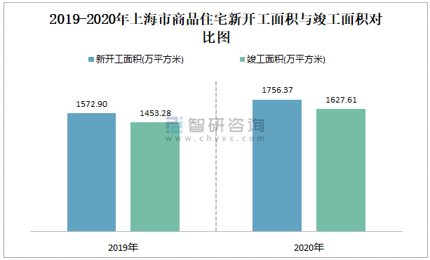 2019-2020年上海市商品住宅新開工面積與竣工面積對比圖