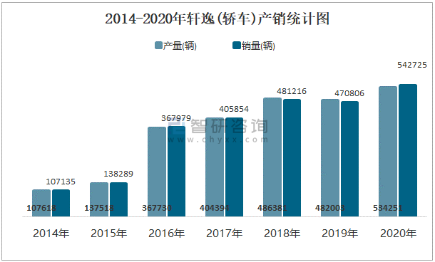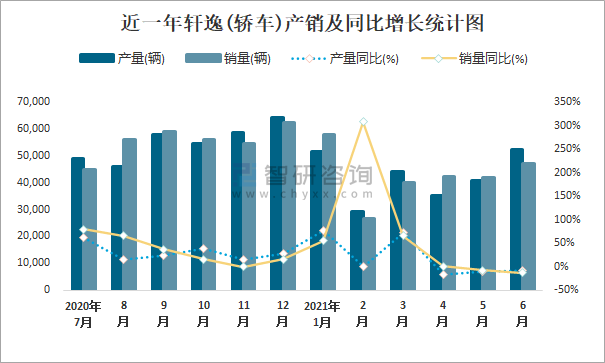 根據中國汽車工業協會數據可知:2021年6月軒逸(轎車)產量為52236輛,同比下降8.4%,銷量為47283輛,同比下降13.2%,當月產銷率為90.52%;2021年上半年軒逸(轎車)產量為253704輛,同比增長24.9%,銷量為256163輛,同比增長22.2%,產銷率為100.97%;2014-2020年軒逸(轎車)產銷量總體呈現上升趨勢,2020年達到最大值,且近7年總產量大于總銷量,積壓了庫存5891輛。