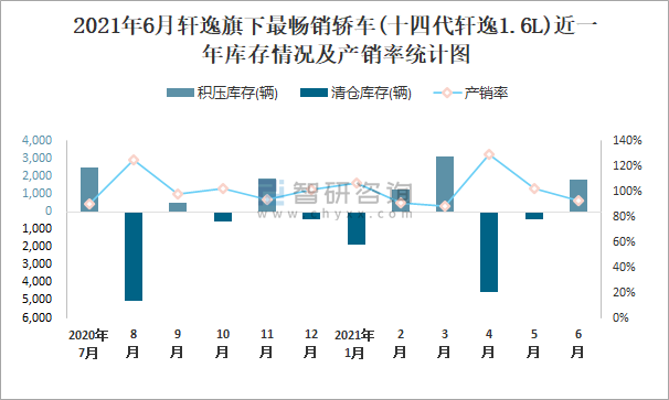 2021年6月軒逸旗下最暢銷車(十四代軒逸1.6L)近一年庫存情況及產銷率統計圖