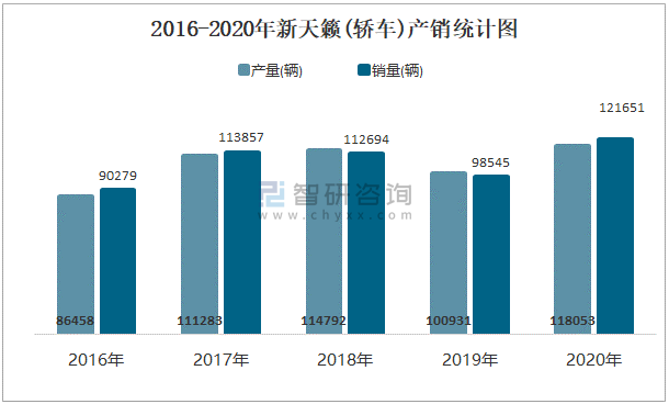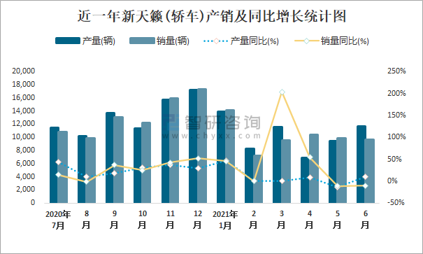 根據(jù)中國汽車工業(yè)協(xié)會數(shù)據(jù)可知:2021年6月新天籟(轎車)產(chǎn)量為11627輛,同比增長9.9%,銷量為9664輛,同比下降10.5%,當月產(chǎn)銷率為83.12%;2021年上半年新天籟(轎車)產(chǎn)量為61600輛,同比增長59.9%,銷量為60865輛,同比增長43.1%,產(chǎn)銷率為98.81%;2016-2020年新天籟(轎車)產(chǎn)銷量總體呈現(xiàn)上升趨勢,且近5年總銷量大于總產(chǎn)量,清倉庫存5509輛。