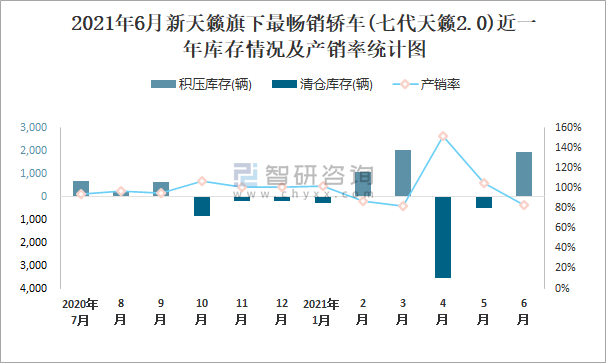 2021年6月新天籟旗下最暢銷車(七代天籟2.0)近一年庫存情況及產(chǎn)銷率統(tǒng)計圖