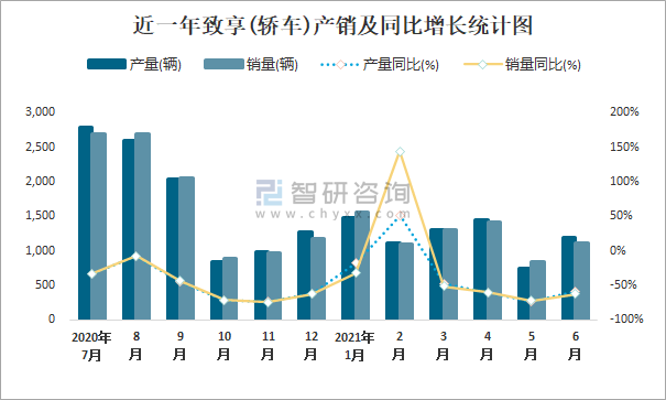 根據中國汽車工業協會數據可知:2021年6月致享(轎車)產量為1189輛,同比下降59.4%,銷量為1115輛,同比下降62.5%,當月產銷率為93.78%;2021年上半年致享(轎車)產量為7272輛,同比下降50.1%,銷量為7309輛,同比下降51.1%,產銷率為100.51%;2017-2020年致享(轎車)產銷量均在2019年達到最高值,此后大幅度下滑,且近4年總產量大于總銷量,積壓了庫存157輛。