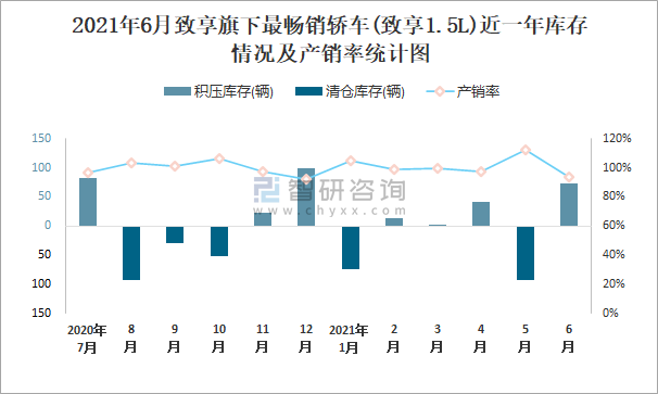 2021年6月致享旗下最暢銷車(致享1.5L)近一年庫存情況及產銷率統計圖