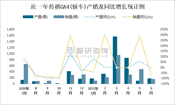 根據中國汽車工業協會數據可知:2021年6月傳祺GA4(轎車)產量為164輛,同比下降0%,銷量為150輛,同比下降68.1%,當月產銷率為91.46%;2021年上半年傳祺GA4(轎車)產量為3154輛,同比下降0%,銷量為2163輛,同比增長129.6%,產銷率為68.58%;2018-2020年傳祺GA4(轎車)產銷量逐年遞減,且近3年總產量大于總銷量,積壓了庫存93輛。