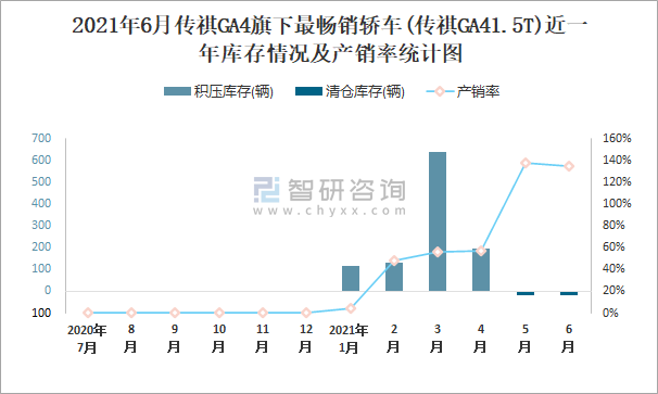 2021年6月傳祺GA4旗下最暢銷車(傳祺GA41.5T)近一年庫存情況及產銷率統計圖