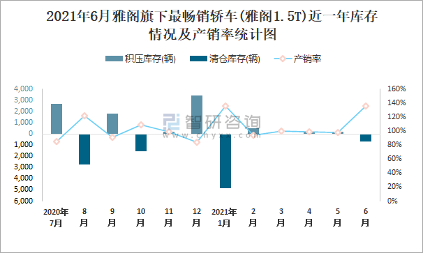 2021年6月雅閣旗下最暢銷車(雅閣1.5T)近一年庫存情況及產銷率統計圖