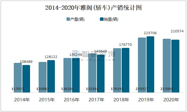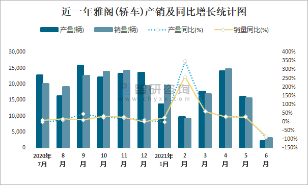 根據中國汽車工業協會數據可知:2021年6月雅閣(轎車)產量為2189輛,同比下降89.9%,銷量為3138輛,同比下降85.1%,當月產銷率為143.35%;2021年上半年雅閣(轎車)產量為83400輛,同比增長3.9%,銷量為89129輛,同比增長9.4%,產銷率為106.87%;2014-2020年雅閣(轎車)產銷量均在2019年達到最高值,此后小幅度下滑,且近7年總產量大于總銷量,積壓了庫存5571輛。