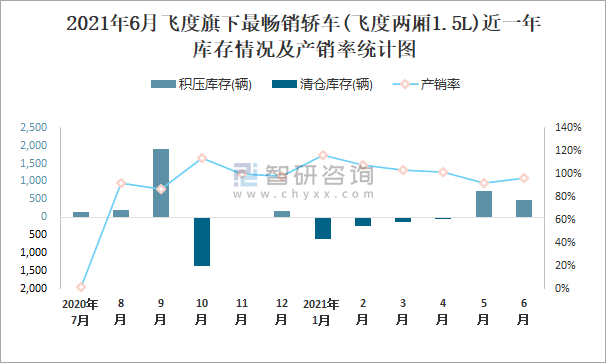 2021年6月飛度旗下最暢銷車(飛度兩廂1.5L)近一年庫存情況及產銷率統計圖