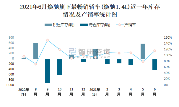 2021年6月煥馳旗下最暢銷車(煥馳1.4L)近一年庫存情況及產(chǎn)銷率統(tǒng)計(jì)圖