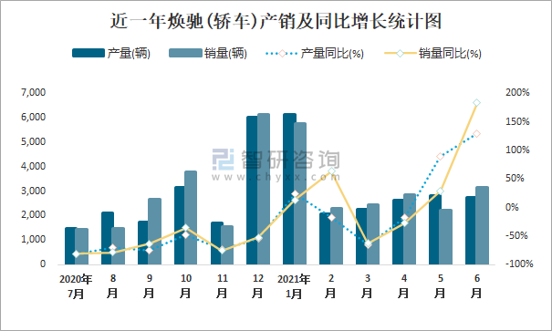 根據(jù)中國汽車工業(yè)協(xié)會數(shù)據(jù)可知:2021年6月煥馳(轎車)產(chǎn)量為2729輛,同比增長129.9%,銷量為3166輛,同比增長182.9%,當(dāng)月產(chǎn)銷率為116.01%;2021年上半年煥馳(轎車)產(chǎn)量為18620輛,同比下降6.1%,銷量為18733輛,同比下降5.4%,產(chǎn)銷率為100.61%;2017-2020年煥馳(轎車)產(chǎn)銷量均在2019年達(dá)到最高值,此后大幅度下滑,且近4年總銷量大于總產(chǎn)量,清倉庫存382輛。