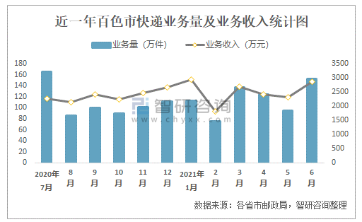近一年百色市快遞業務量及業務收入統計圖