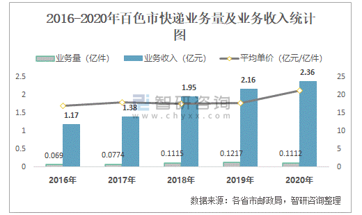2016-2020年百色市快遞業務量及業務收入統計圖