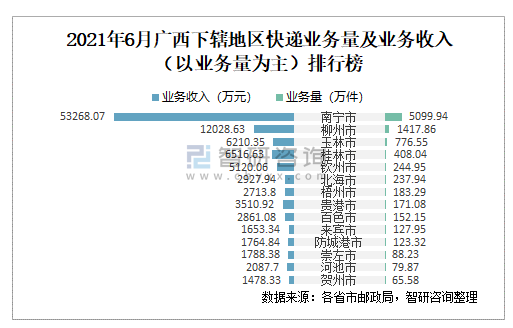 2021年6月廣西下轄地區快遞業務量及業務收入(以業務量為主)排行榜