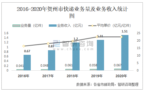 2016-2020年賀州市快遞業(yè)務(wù)量及業(yè)務(wù)收入統(tǒng)計圖