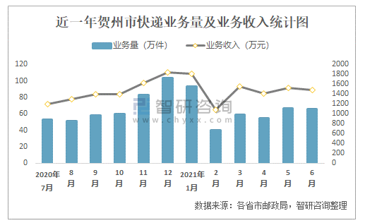 近一年賀州市快遞業(yè)務(wù)量及業(yè)務(wù)收入統(tǒng)計圖