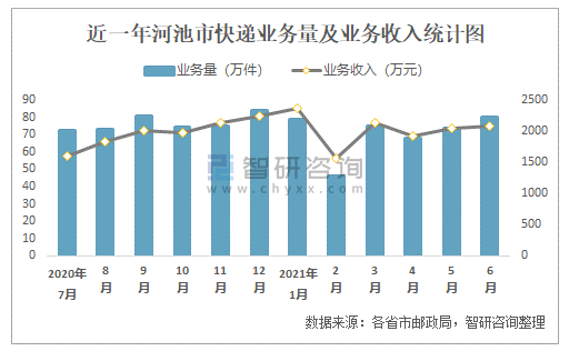 近一年河池市快遞業務量及業務收入統計圖
