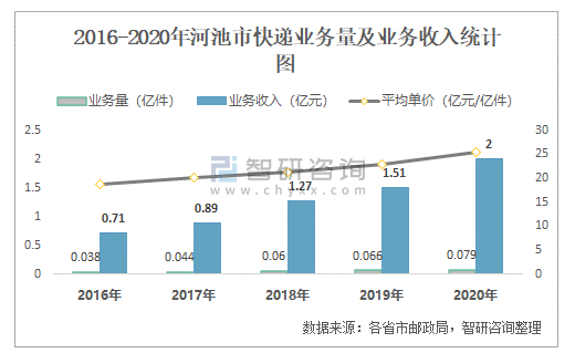 2016-2020年河池市快遞業務量及業務收入統計圖