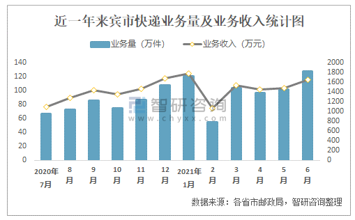 2021年6月來賓市快遞業(yè)務量與業(yè)務收入分別為127.95萬件和1653.34萬元