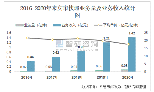 根據(jù)各省市郵政局數(shù)據(jù)可知:2021年6月來賓市快遞業(yè)務量為127.95萬件,業(yè)務收入為1653.34萬元;2021年1-6月來賓市快遞累計業(yè)務量為605.11萬件,同比增長99.65%,累計業(yè)務收入為8973.48萬元,同比增長51.27%;2016-2020年來賓市快遞業(yè)務量與業(yè)務收入均逐年遞增,平均單價總體呈現(xiàn)下降趨勢。