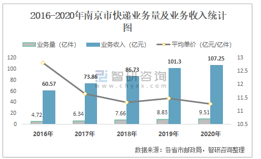 2016-2020年南京市快遞業(yè)務(wù)量及業(yè)務(wù)收入統(tǒng)計(jì)圖
