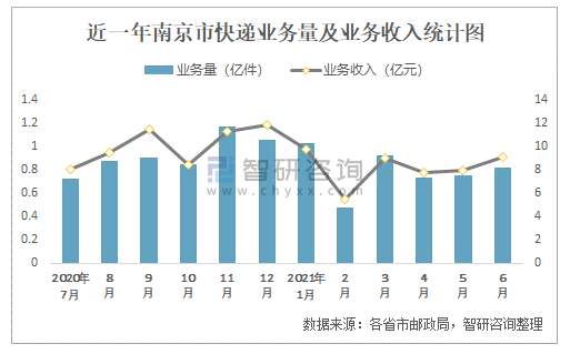 近一年南京市快遞業(yè)務(wù)量及業(yè)務(wù)收入統(tǒng)計(jì)圖