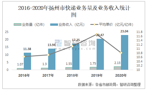 2016-2020年揚州市快遞業務量及業務收入統計圖