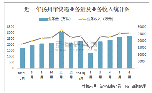 近一年揚州市快遞業務量及業務收入統計圖