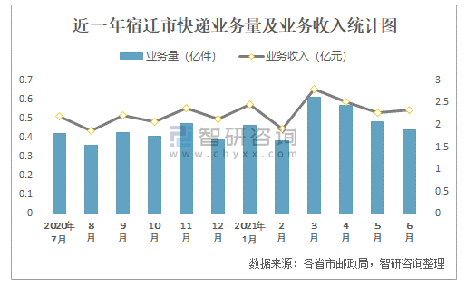 2021年6月宿遷市快遞業務量與業務收入分別為4393.3萬件和23329.5萬元