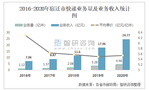 2016-2020年宿遷市快遞業務量及業務收入統計圖