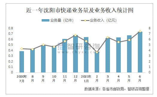 近一年沈陽(yáng)市快遞業(yè)務(wù)量及業(yè)務(wù)收入統(tǒng)計(jì)圖