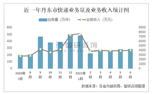 近一年丹東市快遞業(yè)務(wù)量及業(yè)務(wù)收入統(tǒng)計(jì)圖