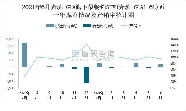 2021年6月奔馳-GLA旗下最暢銷SUV(奔馳-GLA1.6L)近一年庫存情況及產銷率統計圖