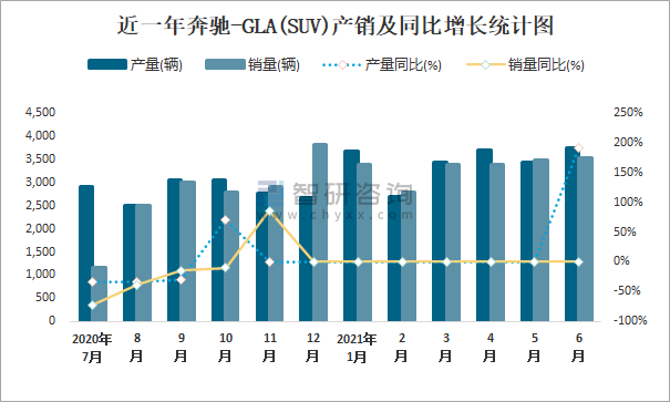 近一年奔馳-GLA(SUV)產銷及同比增長統計圖
