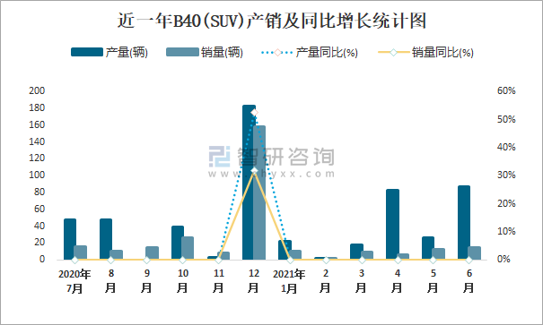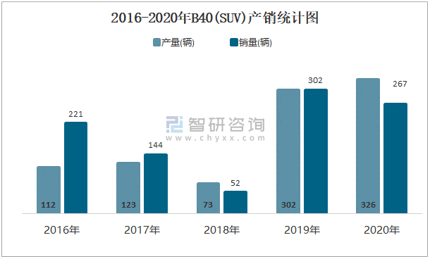 根據中國汽車工業協會數據可知:2021年6月B40(SUV)產量為87輛,同比下降0%,銷量為14輛,同比下降0%,當月產銷率為16.09%;2021年上半年B40(SUV)產量為238輛,同比下降0%,銷量為53輛,同比下降0%,產銷率為22.27%;2016-2020年B40(SUV)產銷量均在2018年跌至最低值,此后有所增長,且近5年總銷量大于總產量,清倉庫存50輛。