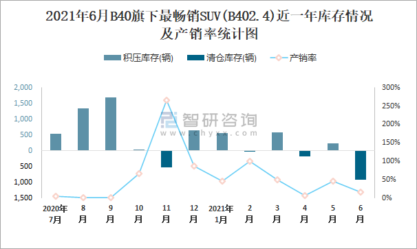 根據中國汽車工業協會數據統計可知:2021年上半年B40(SUV)旗下只有1款SUV在銷售;近一年B402.4共積壓庫存3968輛,其產銷率存在一定幅度波動,2020年11月產銷率最高(266.67%),清倉庫存532輛,2020年8月產銷率偏低(1.46%),積壓庫存1352輛。