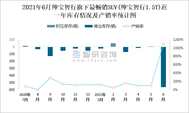 2021年6月紳寶智行旗下最暢銷SUV(紳寶智行1.5T)近一年庫存情況及產銷率統計圖