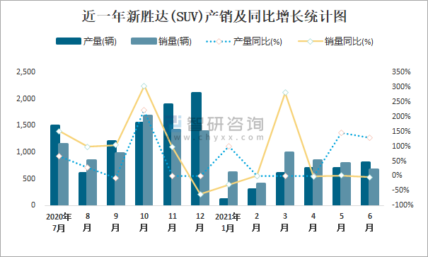 近一年新勝達(SUV)產(chǎn)銷及同比增長統(tǒng)計圖