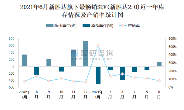 2021年6月新勝達旗下最暢銷SUV(新勝達2.0)近一年庫存情況及產(chǎn)銷率統(tǒng)計圖