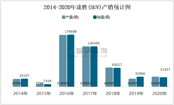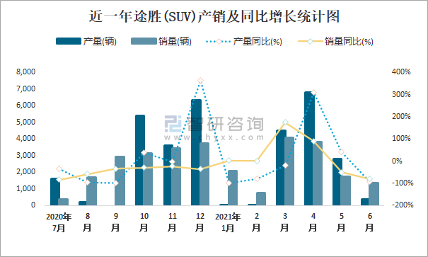 根據中國汽車工業協會數據可知:2021年6月途勝(SUV)產量為354輛,同比下降92.1%,銷量為1329輛,同比下降81.1%,當月產銷率為375.42%;2021年上半年途勝(SUV)產量為14523輛,同比下降8.7%,銷量為13709輛,同比下降14.7%,產銷率為94.4%;2014-2020年途勝(SUV)產銷量均在2016年達到最高值,此后銷量逐年遞減,且近7年總銷量大于總產量,清倉庫存5782輛。