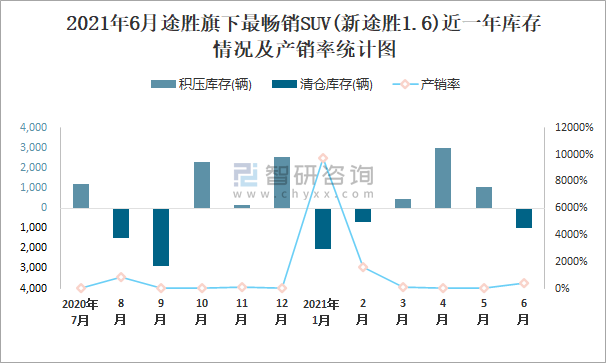 2021年6月途勝旗下最暢銷SUV(新途勝1.6)近一年庫存情況及產銷率統計圖